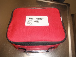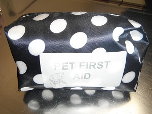 The small size comes with Gauze squares, Gauze roll (can make a muzzle with this item), Non stick pad, Cotton balls, Q tips, Tape, Alcohol swabs, Tongue depressor (splint), Vinyl gloves, Bandage scissors, Tick twister and a Nail trimmer